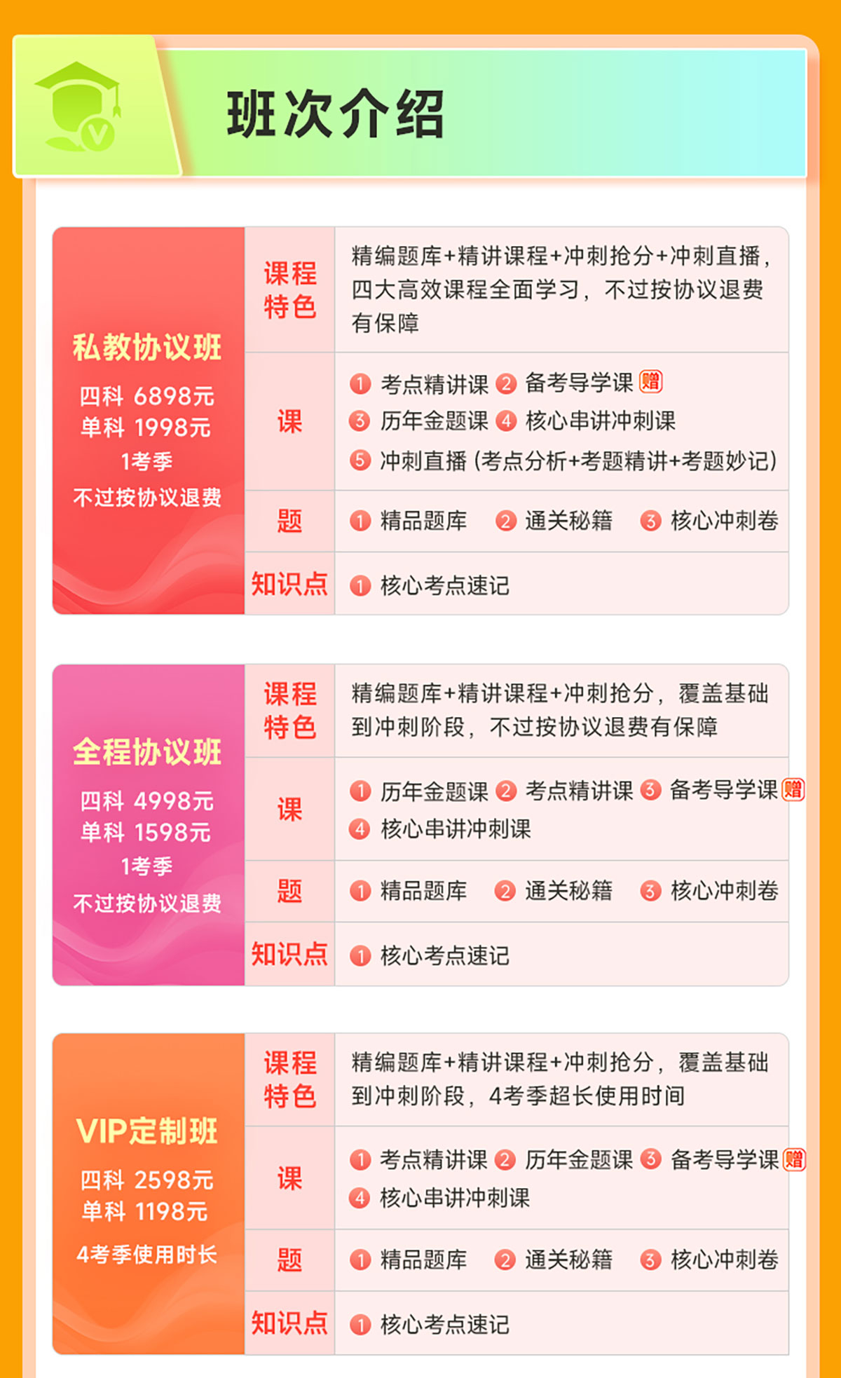 | 冲刺抢分班 | 冲刺阶段重点突破 | 核心串讲+冲刺卷+考点速记 | 四科 588元 / 单科 198元 | 1考季 |