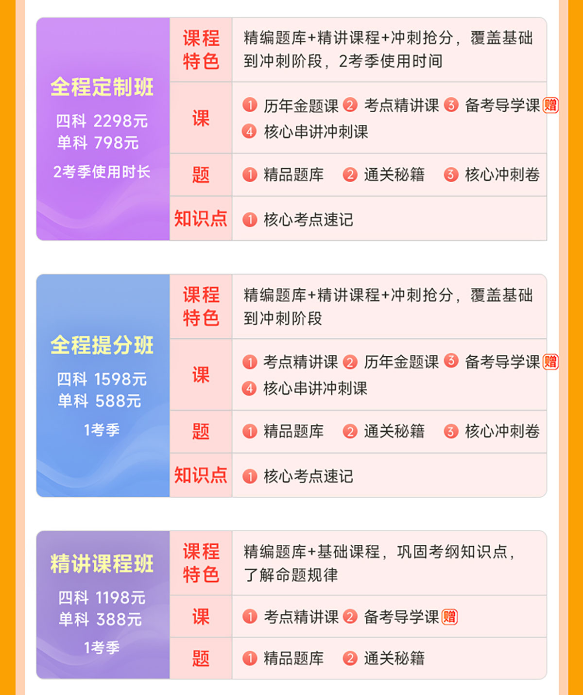 | 考点金题班 | 以刷题为主,巩固考点 | 精品题库+通关秘籍,题海战术 | 四科 298元 / 单科 98元 | 1考季 |