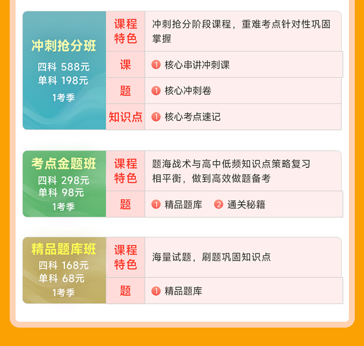 | 冲刺抢分班 | 冲刺阶段重点突破 | 核心串讲+冲刺卷+考点速记 | 四科 588元 / 单科 198元 | 1考季 |